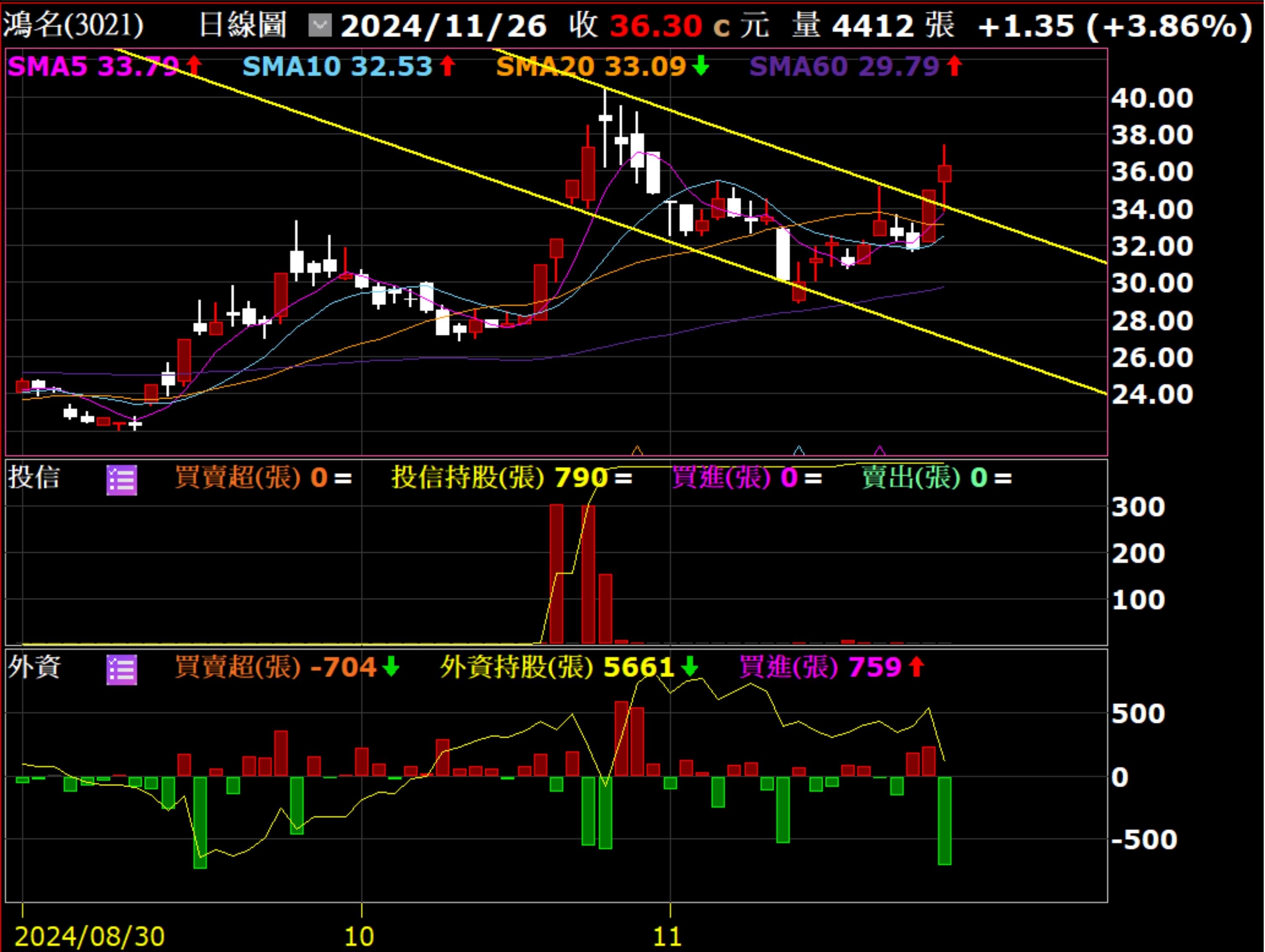 🔸️投信於10月底建倉後就沒賣過了,雖然外資今天賣超500張,但股價在今日突破下降楔型,仍可期待持續向上表態。
