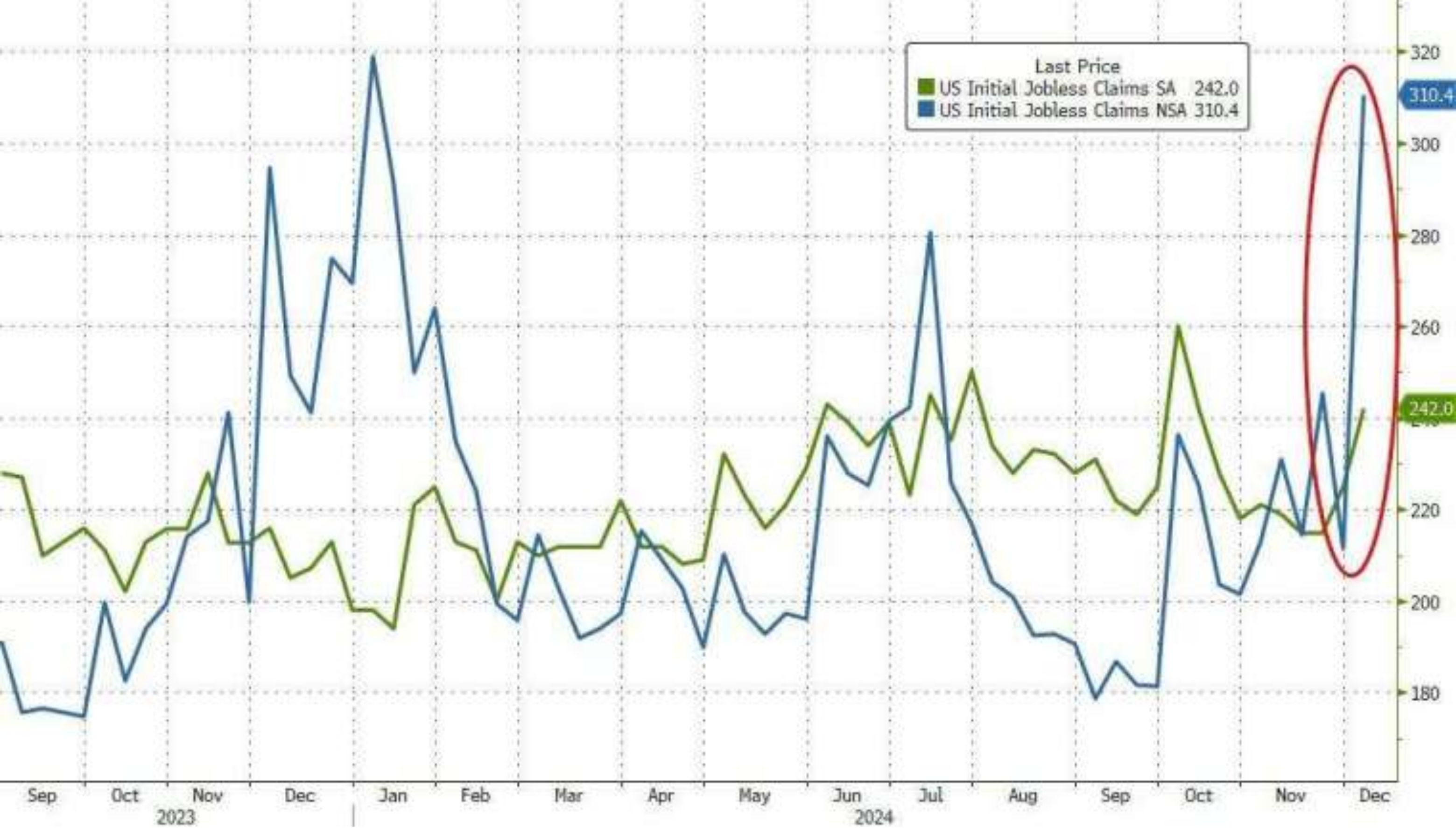 🔸️美國初領失業金人數達24.2萬人,超過市場預期的22.1萬人,顯示勞動力需求下降。分析指出,這可能與感恩節季節性波動有關。