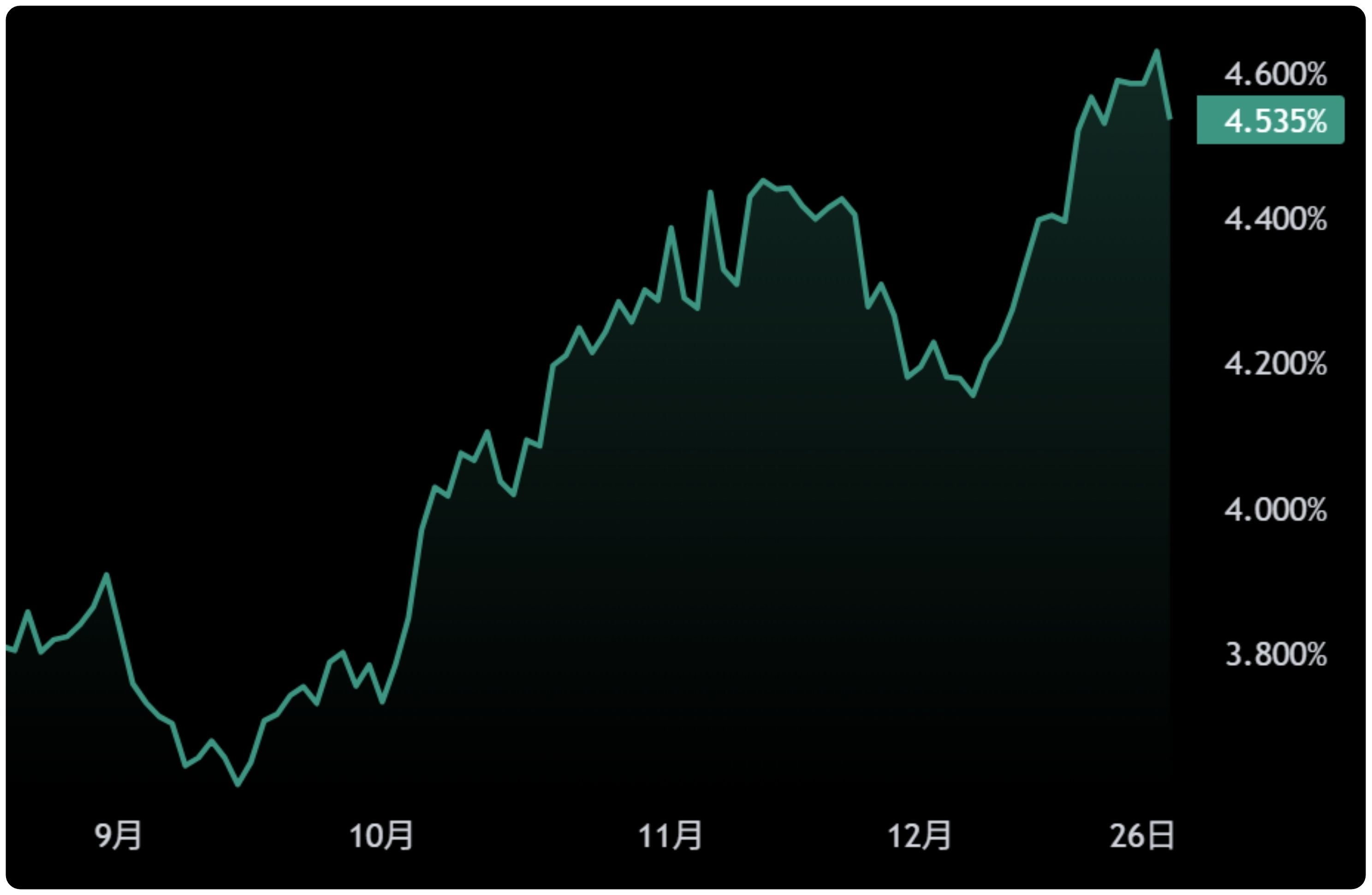 🔸️10年期美國國債殖利率下跌7.4個基點至4.546%,創一個月來最大跌幅,因市場對明年大幅降息的預期和對川普政策前景的擔憂。